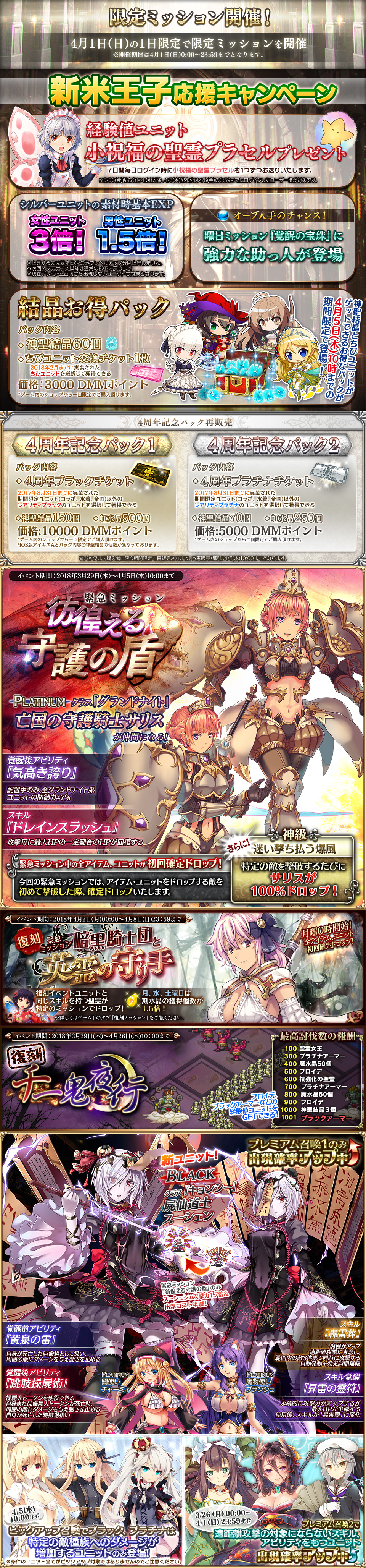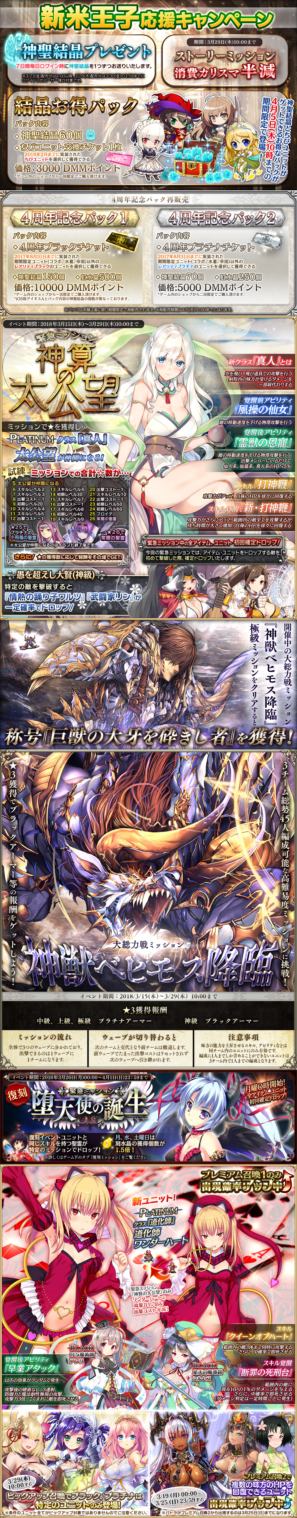 | 帝国騎士と叛逆の戦火 | 試練 | ● ● ● ●![]() | 09/21 | 10/05 | 刻 | 2018 | 08/27 | 09/02 | 漆黒の射手リタ,帝国神官戦士ルチアがドロップ (?9/28 メンテまで) ストーリーミッションの獲得ランクEXP1.5倍 (9/28 メンテ後?) シルバーユニットの合成時基本EXP増加 (女性3倍・男性1.5倍) | ||