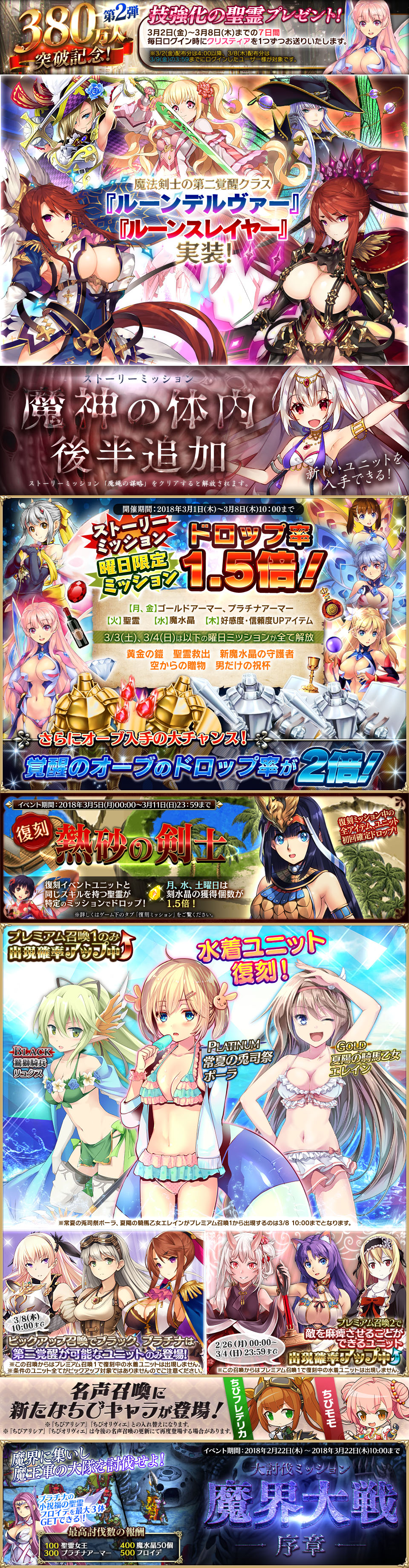 | 曜日ミッション1.5倍 覚醒のオーブ2倍 ストーリーミッション1.5倍 技覚醒の聖霊1.5倍 | ドロップ増加 | ●![]() | 03/01 | 03/08 | |||||||