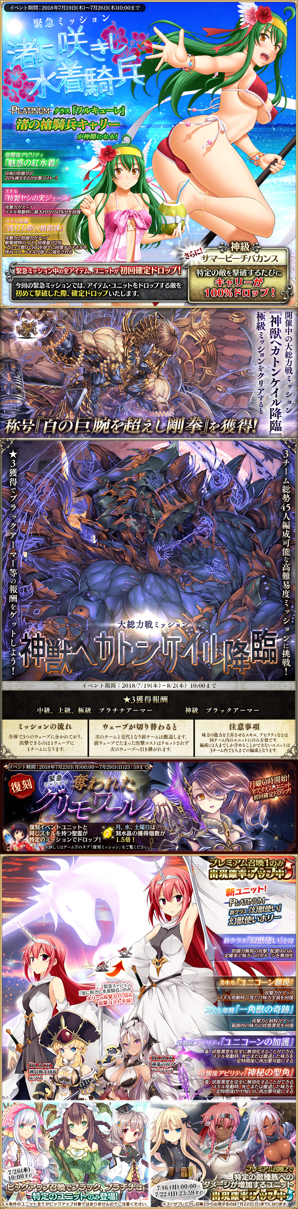 | 大総力戦:神獣ヘカトンケイル降臨 | 大総力戦 | [[●>]] | 07/19 | 08/02 | 極級をクリア(★1でok)すると新たな称号を獲得。 一定間隔で復刻される事が告知されている | ||||||